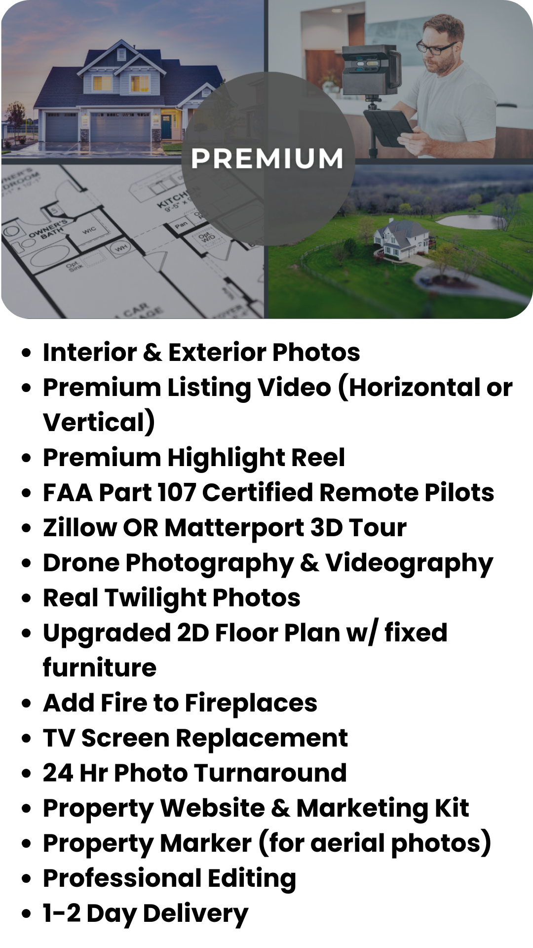 Listing videos are a fantastic way to showcase a property and make a great addition to social media. Our 60-second videos, featuring both standard or premium and drone footage, start priced at $250. We also offer vertical videos for Instagram and Facebook reels, starting at $125.