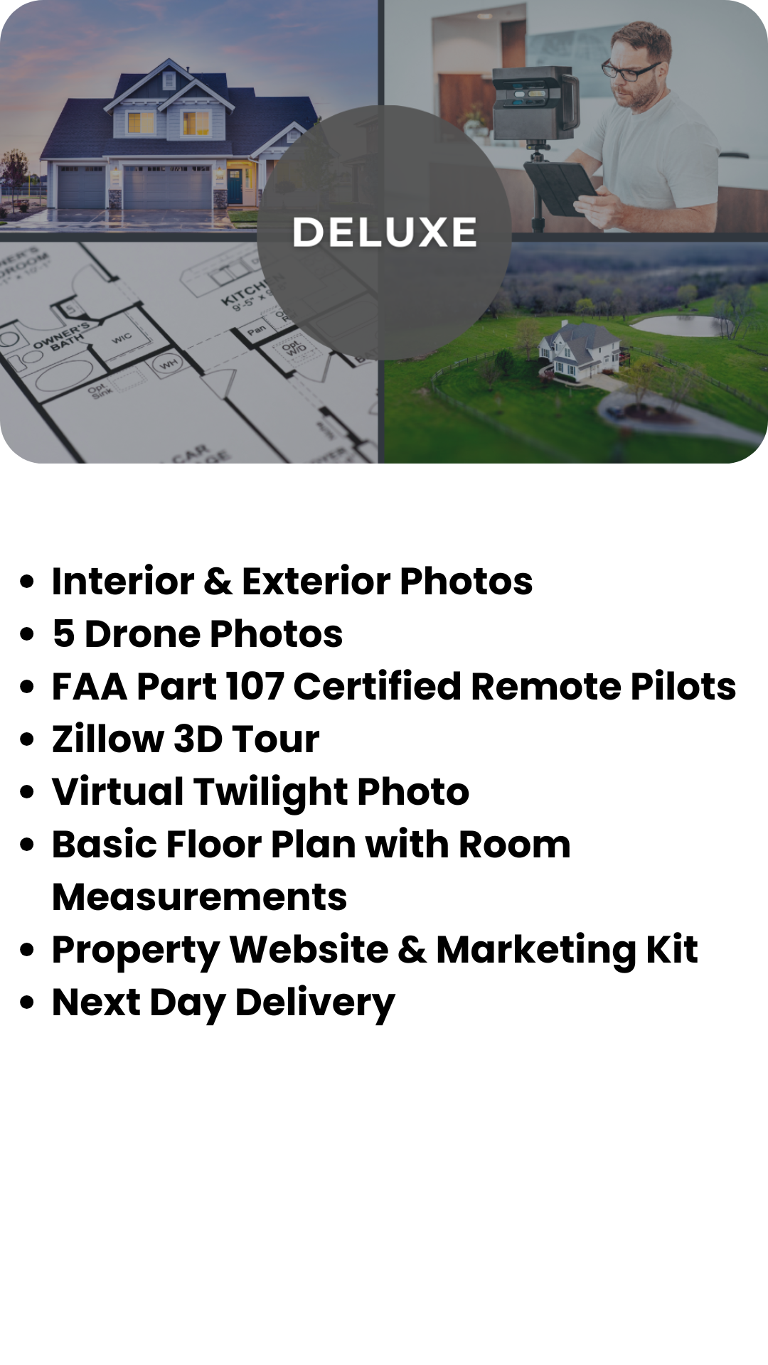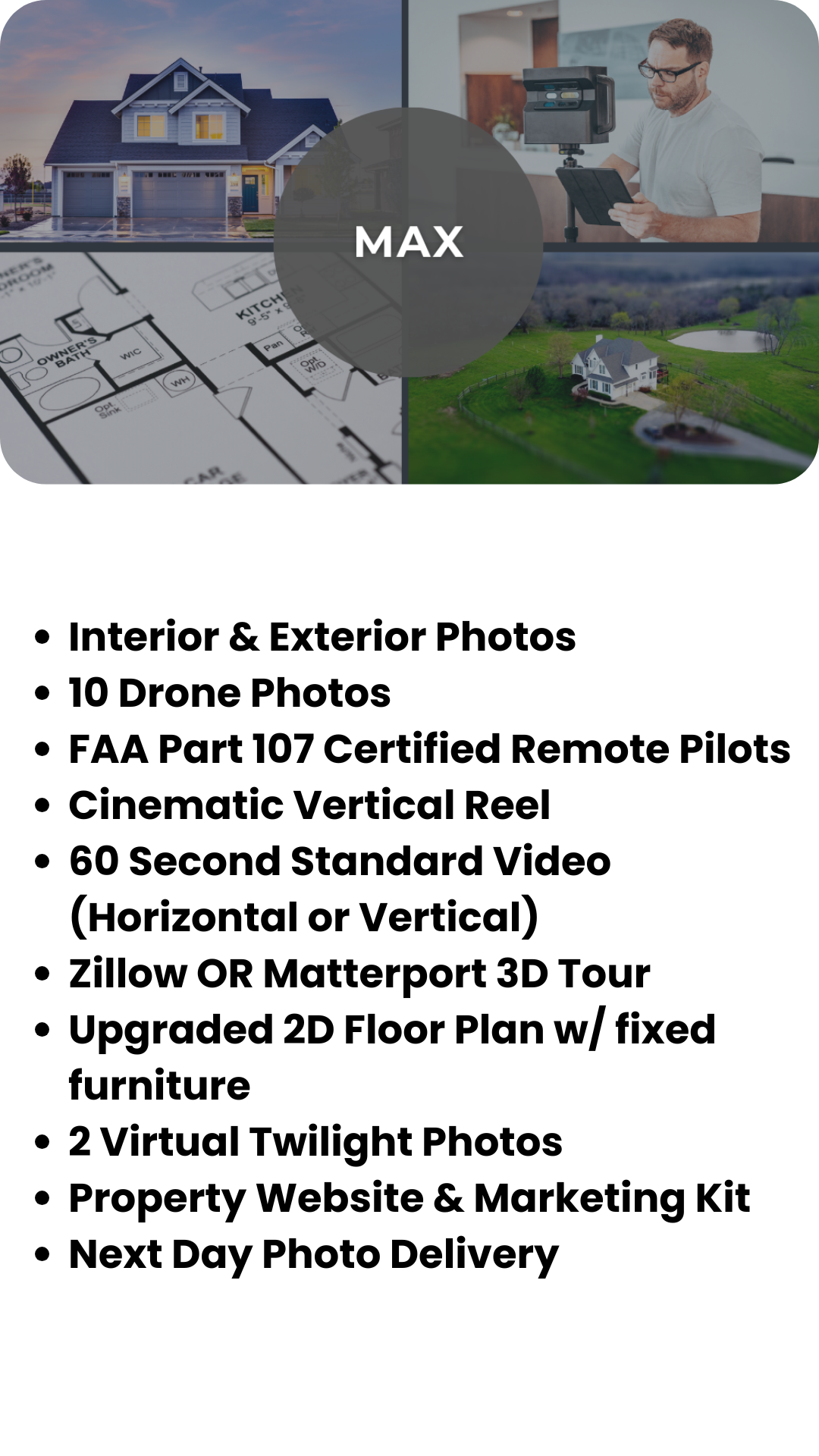 "We provide straightforward, flat-rate pricing for our real estate photography services. For 25 photos, the cost is $165 plus tax, and for 40 photos, it's $195 plus tax, both including floor plans. There are no extra fees for square footage or travel within our service area."